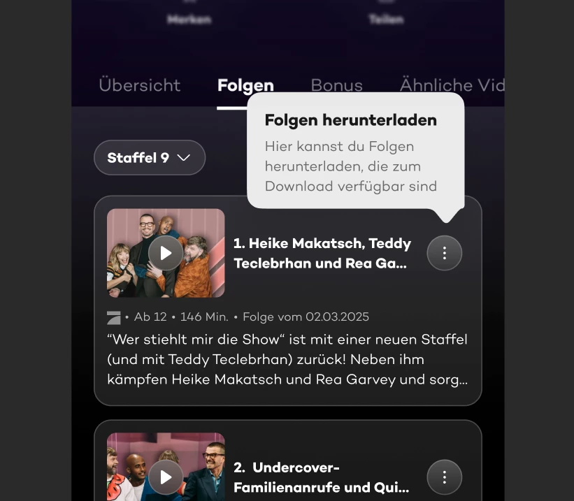 Beachte, dass nicht jeder Inhalt heruntergeladen werden kann. Ist ein Inhalt zum Herunterladen freigeschaltet, siehst du dies in der Folgenübersicht, wenn du auf das Symbol mit den drei Punkten klickst.