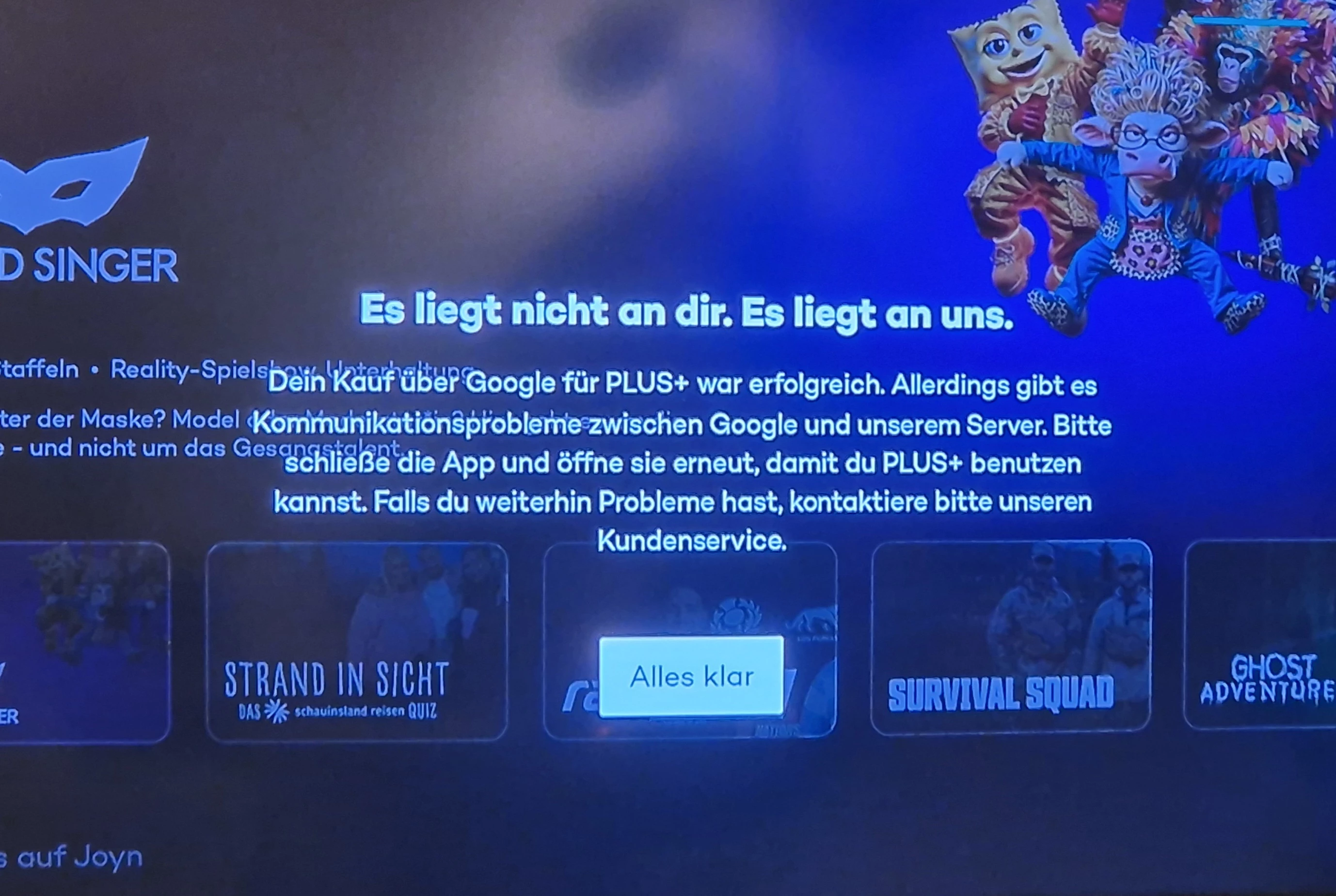 Fehlermeldung: Es liegt nicht an dir. Es liegt an uns. - Dein Kauf über Apple/Google für PLUS+ war erfolgreich. Allerdings gibt es Kommunikationsprobleme zwischen Apple/Google und unserem Server. Bitte schließe die App und öffne sie erneut, damit du PLUS+ benutzen kannst. Falls du weiterhin Probleme hast, kontaktierte bitte unseren Kundenservice.