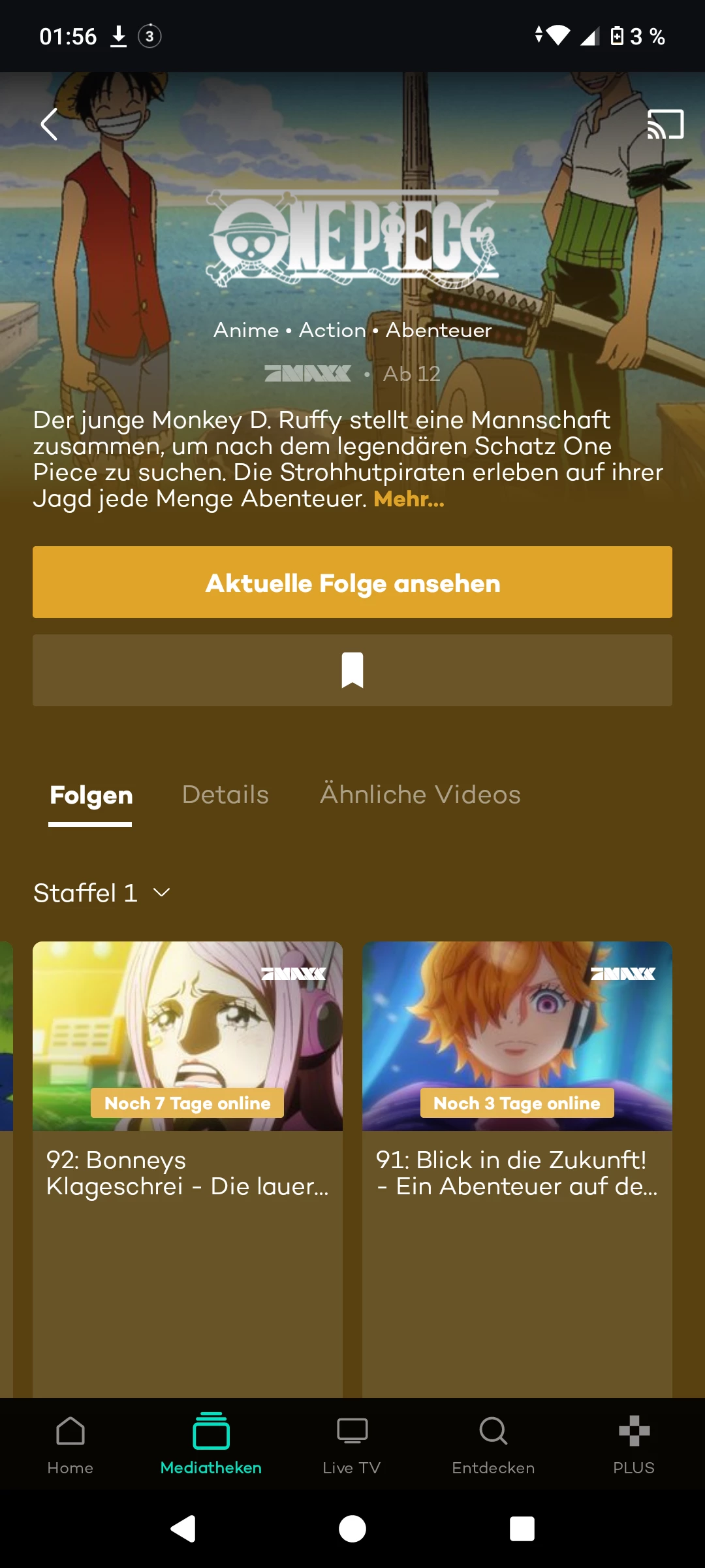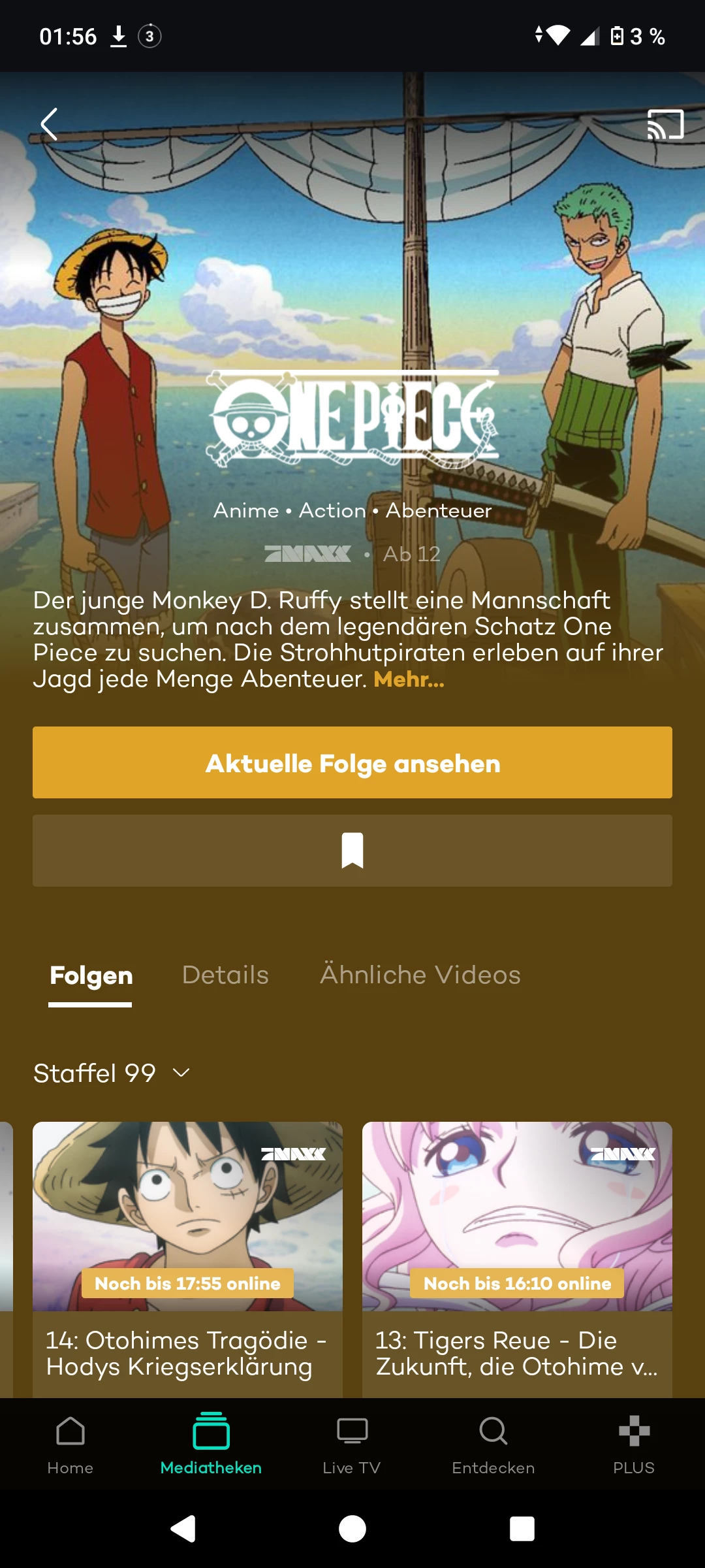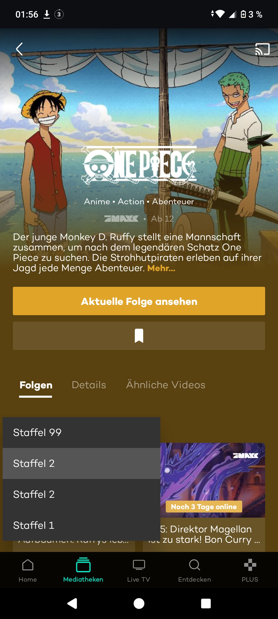 Anderen wollte ich euch darauf hinweisen dass bei mir Staffel 99 angezeigt wird was für ein darstellungsfehler ist und peace ist bis zum aktuellen Stand eine einzige Staffel, man kann es auch in arks einteilen das habe ich euch aber schon in älteren Beiträgen von mir erklärt kann man sich gerne mal auf mein Profil durchlesen wenn man sich Briefen möchte ich werde das hier jetzt nicht noch mal wiederholen.