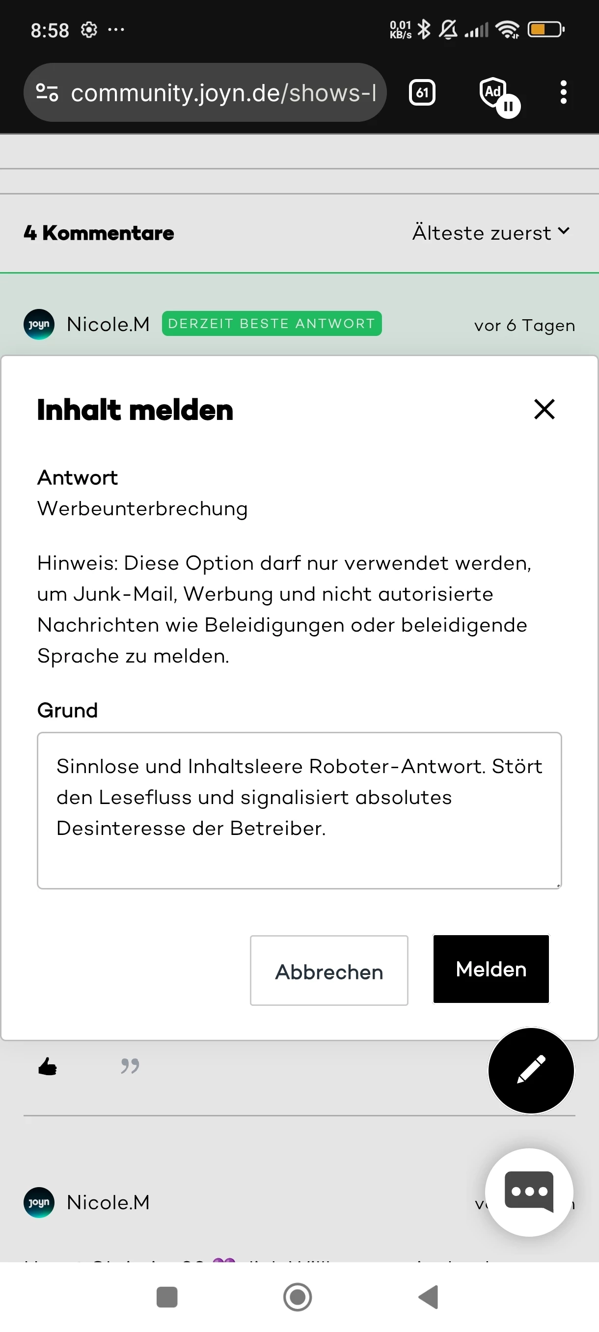 es wird zwar nichts ändern, aber ich muss jetzt mal was loswerden. Ich habe immer gern The Voice geschaut und ich verstehe auch, dass Werbung notwenig ist, aber ich schaue gerade die zweite Sendung in der inzwischen schon zum dritten Mal mitten im Song Werbung kommt. Ich kann die Werbeunterbrechung ja überall nachvollziehen, aber mitten in einem Song? Das muss doch anders lösbar/programmierbar sein. Wenn das so weitergeht schau ich nicht weiter. Das macht so echt keinen Spaß mehr. Und ich glaube da geht es nicht nur mir so.